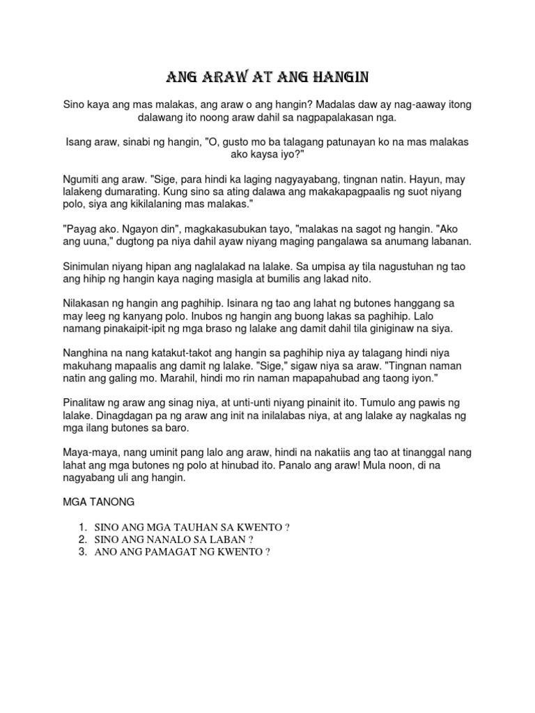Ngayon din magkakasubukan tayo malakas na sagot. Si Juan at ang mga Alimango Ang Sapatero at ang mga Duwende Ang Araw at ang Hangin at marami pang iba. Madalas daw ay nag-aaway itong dalawang ito noong araw dahil sa nagpapalakasan nga.